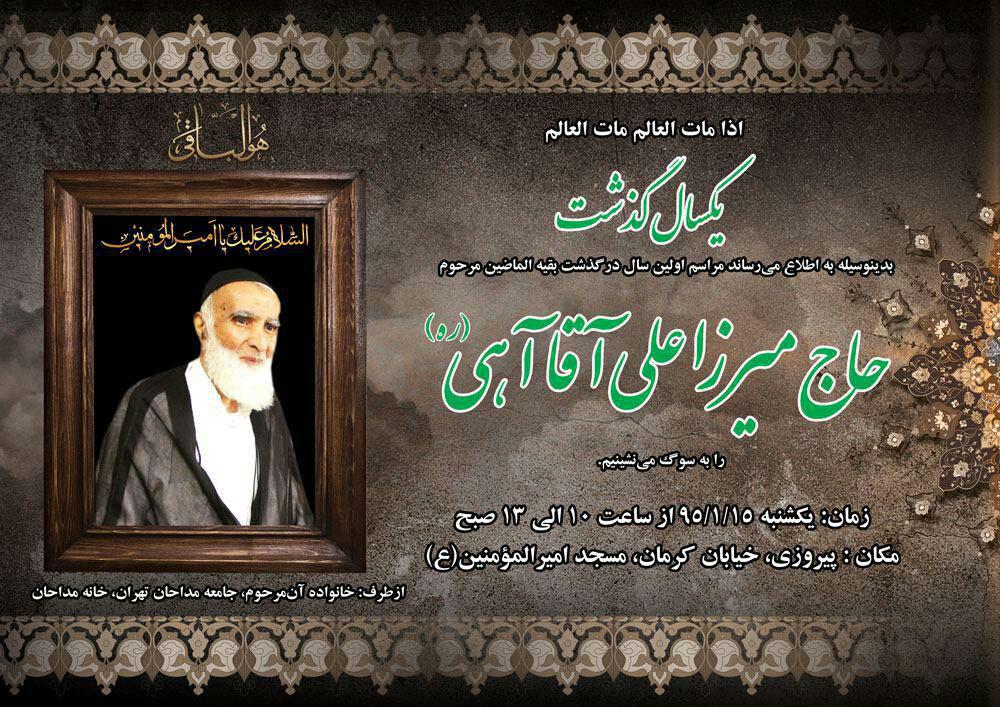 مراسم اولین سال درگذشت مرحوم حاج علی آهی، یکشنبه15 فروردین ماه برگزار می شود.