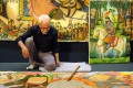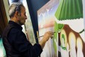 این هنرمند نقاش كه در طول برگزاری اجتماع «خیمهها و نجواها» اثری را خلق كرد،گفت: اصولا نقاشی پردهای باید روی دیوار كار شود، اما به دلیل آنكه من دوبار سكته كردم، نمیتوانم ایستاده كار كنم و باید روی زمین بنیشینم و نقاشی كنم. در اصل كار ما خیالیسازی است و هر چه كه در ذهنمان است را به بوم منتقل میكنیم.