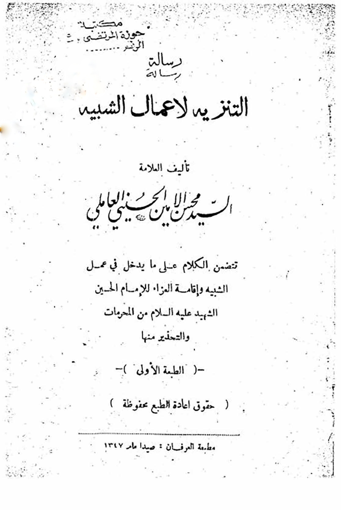 al-tanzihبا وجود استفتاهایی که در نجف صادر شده بود و در فضای ملتهب آن دوران، سید محسن امین که مخالفین خود را گروهی می‌دانست که صرفاً باعث تهییج عوام و قشریون شده‌اند[۱۶]، با انتشار کتاب معروف خود با نام «التنزیه لأعمال التشبیه» در سال ۱۳۴۷ هـ ق، آتش بحث را شعله‌ور کرد و دامنه جدال را به میان عوام شیعیان که داغ‌دار ماجرای تخریب بقیع در همان سال‌ها بودند، کشاند، تا جایی که بسیاری طرح سخنان سید محسن امین و پیش از او سید مهدی قزوینی را امتداد همان داغ و مصیبت بقیع معرفی کردند. پیش‌تر، شیخ عبد الحسین صادق العاملی (ت ۱۳۶۱ هـ) که از علمای نبطیه بود، در سال ۱۳۴۵ هـ ق در کتاب «سیماء الصلحاء» به رد سید مهدی قزوینی و نوشتارهای قبلی سید محسن امین پرداخته بود و به شدت از تمام مظاهر عزاداری، از اصل حزن و بکاء تا تشبیه و قمه‌زنی دفاع کرده بود. وی در این کتاب بدون اشاره به نام گوینده، عبارات مخالفین را با تعبیر «قالوا» آورده و سپس به نقادی آن‌ها می‌پرداخت. نکته عجیب در میان اشکالاتی که وی در کتاب خود از ایشان نقل کرده است، هرچند به نام گویندگان تصریح نشده است، تعابیری است که شباهت عجیبی با نقدهای وهابیت بر مذهب شیعه در باب عزاداری و گاه کاملاً متناسب با ادبیات عامه، دارد و اگر نبود استنادهای مکرر به منابع حدیثی شیعه، خواننده به این یقین می‌رسید که منتقدین اساساً تناسبی با مذهب شیعه ندارند. البته از آنجا که نویسنده نه به نام صاحبان اشکال اشاره کرده و نه امروزه به مقالات سید محسن امین که پیش از این کتاب منتشر شده بوده است، دسترسی وجود دارد، نمی‌توان منقولات او را دقیقاً تعیین کرد.