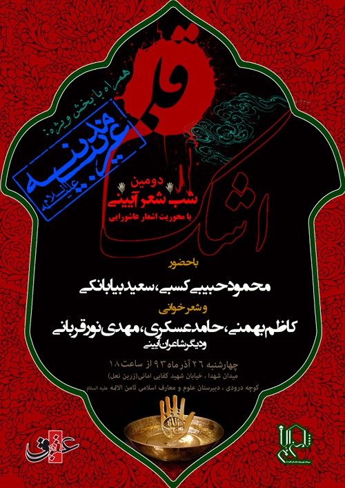 برنامه شب شعر آئینی اشک قلم برای دومین سال پیاپی، به همت دبیرستان علوم و معارف اسلامی ثامنالائمه و پایگاه اطلاع رسانی محافل مذهبی(عقیق) برگزار میشود.