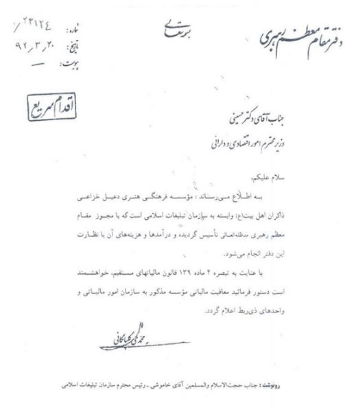 در سال 1392، حجتالاسلاموالمسلمین محمدی گلپایگانی مسئول محترم دفتر مقام معظم رهبری در نامهای به وزیر وقت اقتصاد اعلام نمودند که کلیه فعالیتهای مالی بنیاد دعبل زیر نظر بیت مقام معظم رهبری بوده و مورد تائید است.