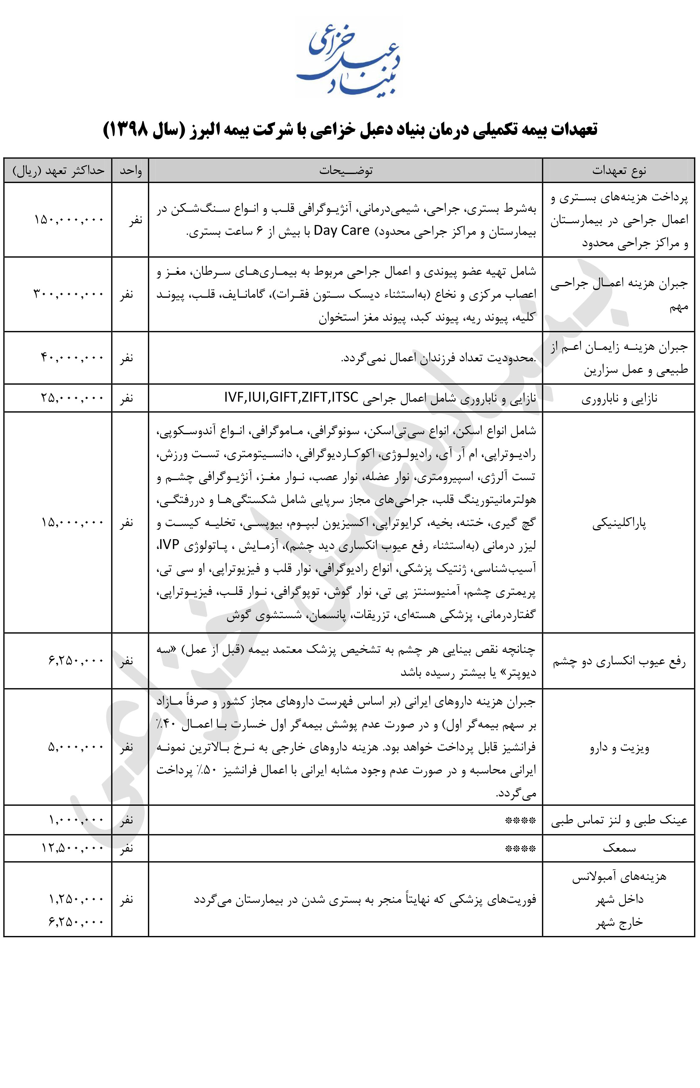 1. قرارداد جدید بیمه تکمیلی درمان بنیاد دعبل با شرکت بیمه البرز خواهد بود.