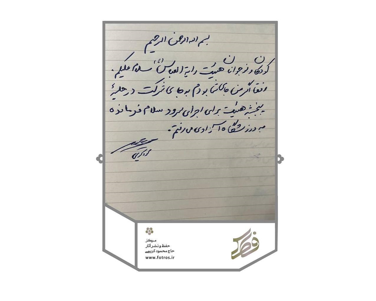 «کودکان و نوجوانان هیأت رایةالعباس (علیهالسّلام)؛ سلام علیکم. رفقا اگر من جای شما بودم، به جای شرکت در جلسه پنجشنبه هیأت، برای اجرای سرود سلام فرمانده به ورزشگاه آزادی میرفتم.»